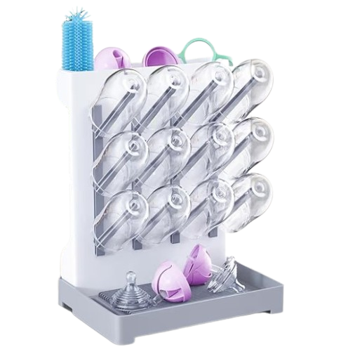 This bottle drying rack is designed to keep bottles, lids, and accessories clean, dry, and organized.