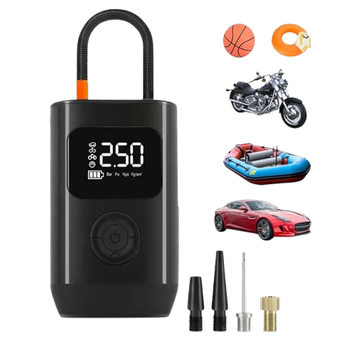 The tire inflator is a compact and portable device designed to quickly inflate car, bike, and motorcycle tires with ease. It features a high-pressure motor that delivers fast and efficient air flow, often equipped with an automatic shut-off to prevent overinflation. Lightweight and easy to store, it is perfect for roadside emergencies or regular maintenance. Many models come with an LED display for precise pressure monitoring and an integrated flashlight for nighttime use. It usually includes multiple nozzle adapters to fit various tire types, including sports equipment and inflatables. Powered by either a car cigarette lighter, battery, or USB charging, it offers versatile operation. Its durable construction ensures long-lasting performance, while quiet operation adds convenience. Quick setup and simple controls make it user-friendly even for beginners. Overall, the tire inflator is an essential tool for safe and stress-free travel.